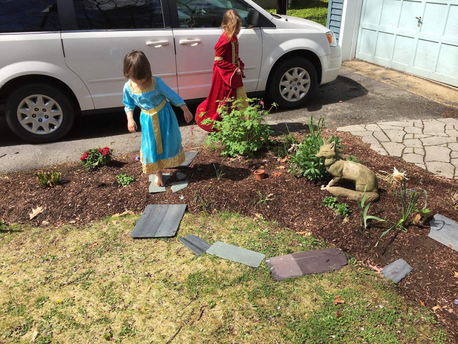 Maria’s birthday party was Sunday afternoon. It was understandably subdued. The kids were tired, and the number of children was small—at Maria’s behest, we had only three kids over for the party. Still, we had fun romping in the backyard, playing with hoola hoops and bean bags. Our friend David demonstrated how to lasso a stump. Donnie and I pulled out our musical instruments. Poor Louisa was a bit moody. She finds it most comfortable to be in the center of attention; other people’s birthday parties are difficult. Maria loved her presents—a paintable teaset and a set of knitting looms. She has already painted the teaset, and used a loom to knit her own version of a cozy for the teapot. She has scheduled a fish-themed tea party for this afternoon (thus bringing together all her presents).